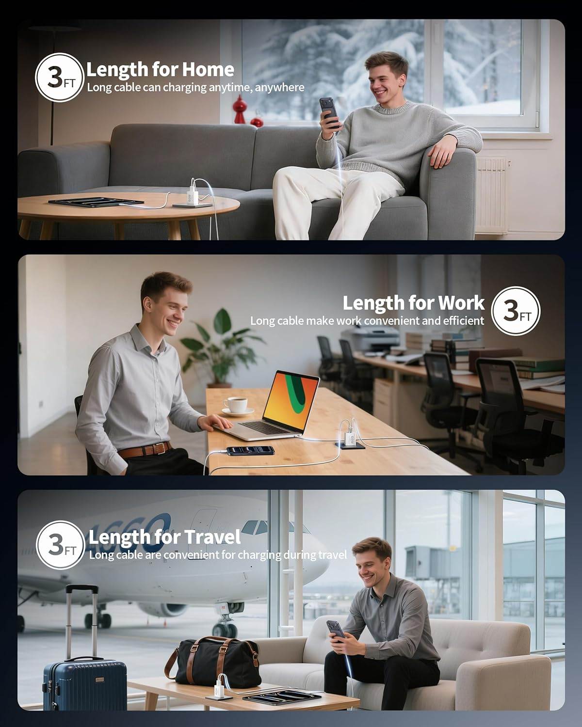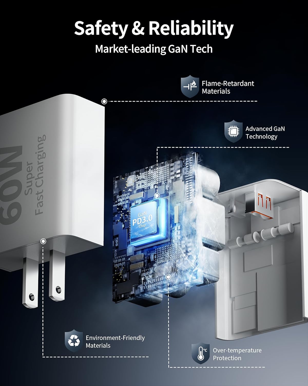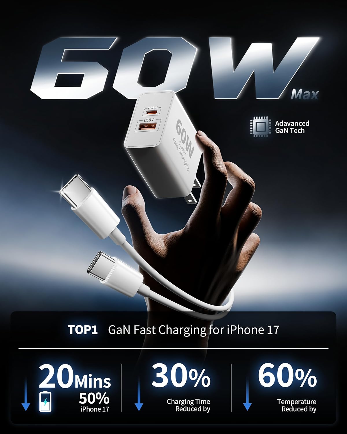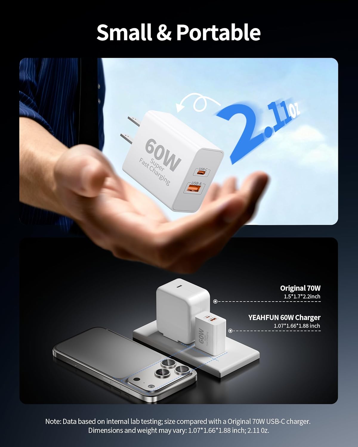 【Item Details】Model Number: HM3539 Manufacturer: SHENZHEN SORGHUM RED ELECTRONICS TECHNOLOGY CO., LTD 60W iPhone 17 Super Fast Charger: The USB C fast charger block offers 60W Max charging speeds, charge for iPhone 17 Pro Max up to 50% with in 20 minutes. Dual-Port design include 1 USB-C port (Max 40W) and 1 USB-A port (Max 20W), provide consistent and convenient charging for your two devices 3FT iPhone 17 Charger Cord : Sturdy and durable USB-C to USB-C fast charging cable, supporting fast charging speed up to 60W, while achieving efficient 480Mbps data synchronization. The extended 3ft long charging cable allows you to flexible charge in home, office, or travel, making it the perfect companion for on-the-go charging Safety & Reliable: This 60W GaN fast charger adopts market-leading GaN technology, reducing charging time by 30% and temperature by 60%. It also features multiple built-in safety protection measures to safeguard your device from damage caused by short circuits, over-current, over-voltage, over-heating and over-charging Universal Compatibility: 60W USB C fast charger compatible with iPhone 17/17e/17 Pro/ 17 Pro Max/Air, iPhone 16/16 Plus/16 Pro/16 Pro Max/16e, iPhone 15/15 Plus/15 Pro/15 Pro Max, iPad Pro M4/6th/5th/4th, iPad Air 13/11inch(2026), iPad Air M3/M2/5th/4th, iPad A16/10th/11th, iPad Mini, Galaxy S26/S25/S24/S23, Pixel 10/9/8, Tablet, Android Phone, and more What You Get: 3 x 60W Dual Port USB C Wall Charger Power Adapter, 3 x 3FT Long Type C to Type C Charging Cable. Perfect for on-the-go professionals and students, it is a perfect for iPhone 17 accessory. If you encounter any problems while using the YEAHFUN charger, feel free to contact our customer service team